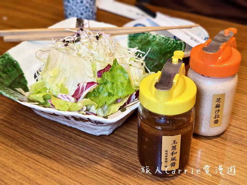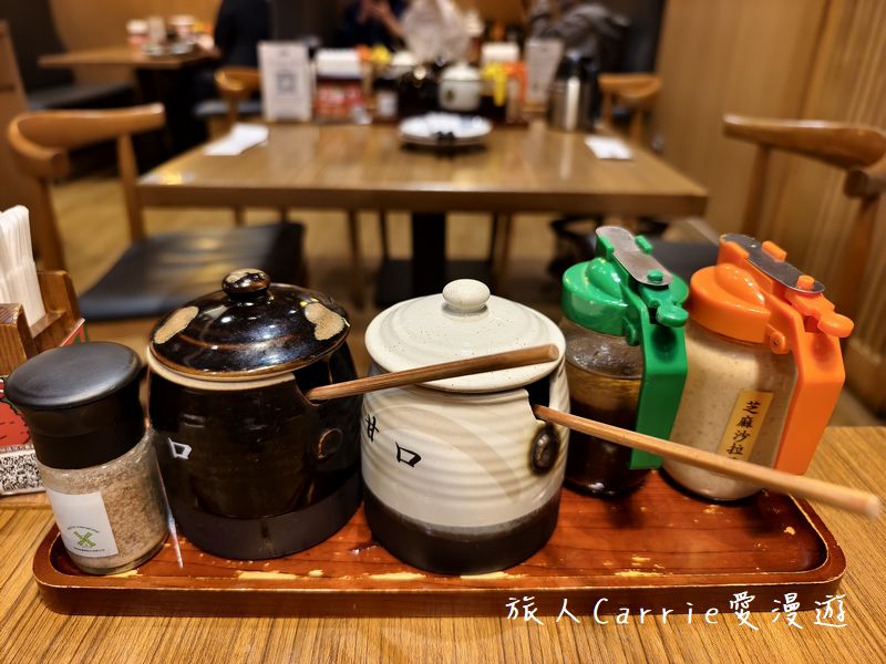 餐桌上已經先擺設好甘口豬排醬和辛口豬排醬、玉蔥和風醬與芝麻沙拉醬,