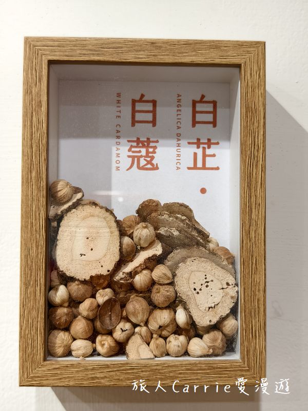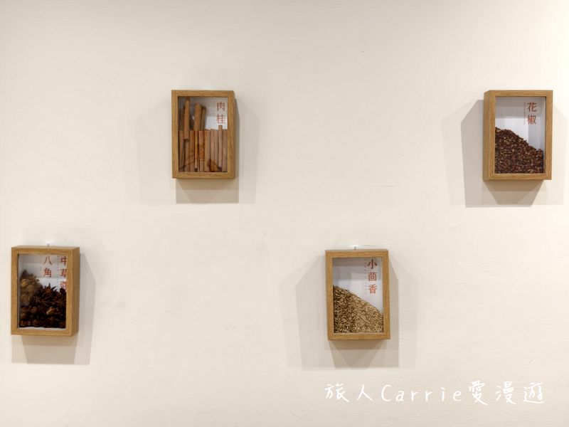 右邊牆面上懸掛著製作麻辣醬的香料介紹實物標本框。