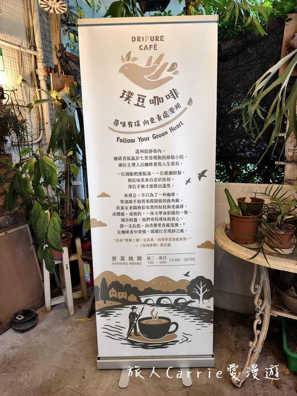 台北市大安區咖啡店推薦哪一家?推薦這家位於溫州街的「璞豆咖啡Dripure Café」,Carrie於2025年11月13日(四)這天和好友一起前往,藏身於溫州街的靜巷間,七里香與綠植圍繞的小院,瀰漫著溫柔的咖啡香氣。兩位主理人,一位專注於吧檯的細節,一位以料理書寫日常,相信美味來自最初的真誠,手作能傳遞人心的溫度。來到璞豆,不只是為了一杯咖啡,更是為了遇見那份純粹與靜好。穿過男主理人親手照料的鹿角蕨,欣賞女主理人以拾得的枯枝與老窗扉布置出的詩意角落,或獨坐沉思,或與友相聚,不經意間,一抹文學氣息在眼前流轉。在城市的喧囂裡,我們尋找那一份璞真,撐一支長匙,向綠意深處緩緩漫溯——在咖啡香中,走進屬於自己的寧靜與回甘。