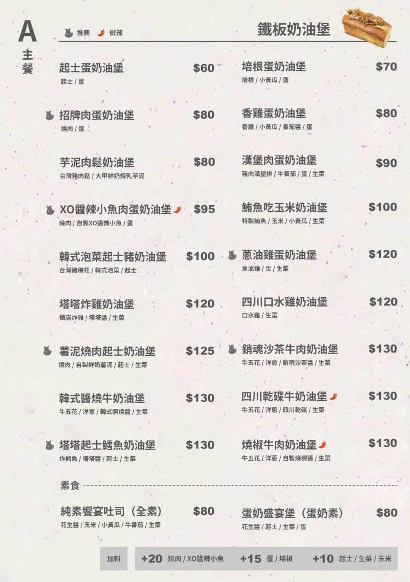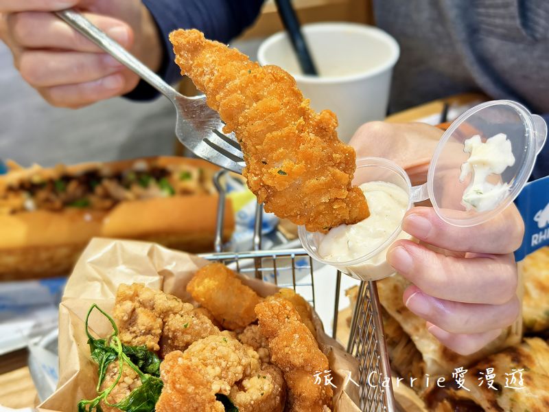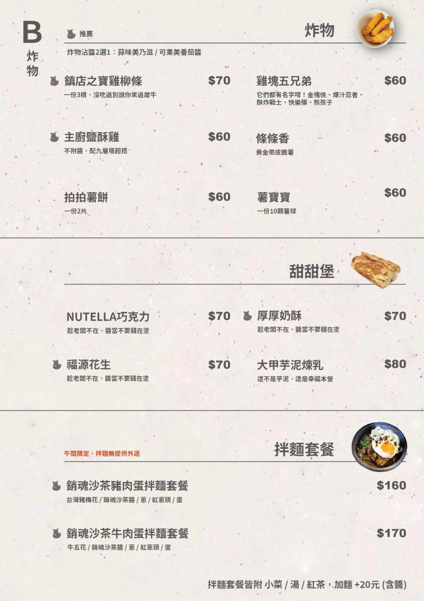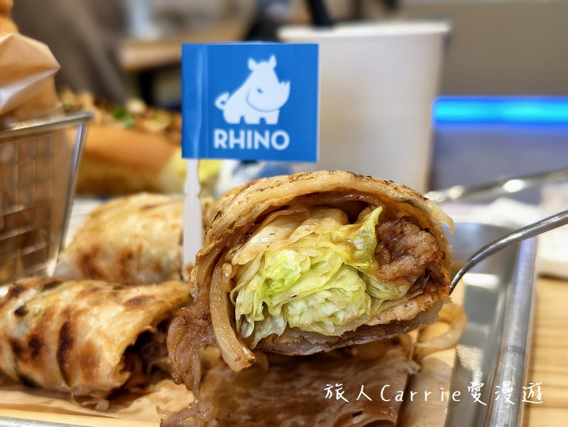 「犀牛RHINO茶食文化」提供拌麵、奶油堡、鐵板捲餅、炸物、料理包外帶。