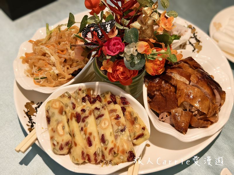 晶宴四喜拼盤:櫻桃烤雞/五味冰捲/烏魚子堅果乳酪/雲耳海蜇