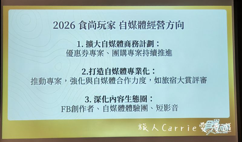【食尚玩家 2025 自媒體大會】這場一年一度專屬 BLOGGER/INSTAGRAM 創作者/KOL 的盛會,年度最盛大的自媒體盛會,就是自媒體尾牙,最期待的自媒體同學會時光!感謝〔食尚玩家〕精心籌備,不但有各式豐盛料理,贊助廠商火力全開,滿滿的伴手禮禮物多到登機箱塞到極限,外加3個大提袋裝滿,回家直接擺好擺滿一桌!【旅人Carrie愛漫遊】成為食尚玩家駐站部落客一路走來也4年了,合作愉快、互相成長、曝光滿滿、好康連環,真的超幸福!期待2026新的一年有絕佳默契好合作!