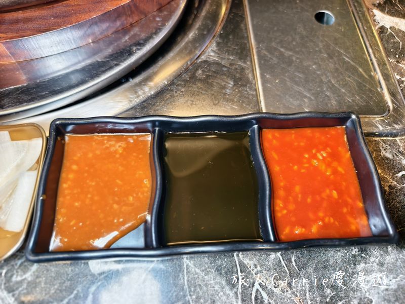 各式沾醬、蒜片、辣椒通通到位,