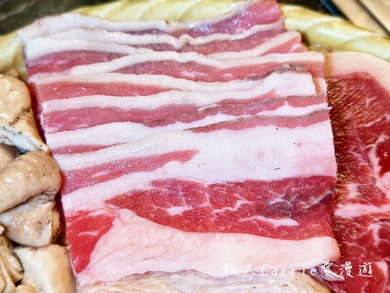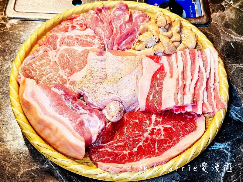 牛板腱、牛五花、豬臉肉、豬五花肉、豬梅花肉、炭香雞腿肉、大邱大腸,