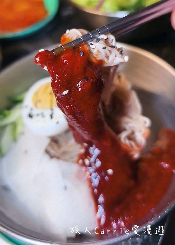 水冷麵使用蕎麥麵,麵條細長有彈性,