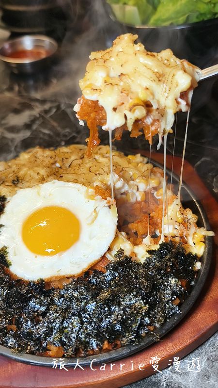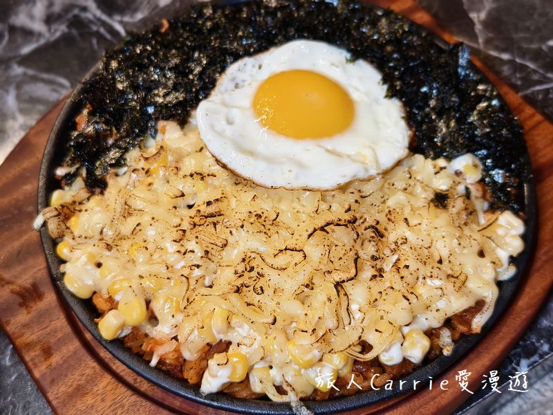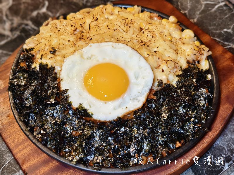 鐵板起司泡菜炒飯給料超豪邁,厚實的起司和海苔鋪滿整鍋,