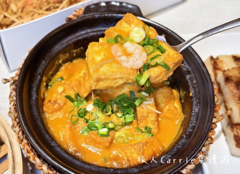 「蟹意蝦滿豆腐煲」軟嫩的雞蛋豆腐吸滿濃郁蟹香醬汁,滑嫩又香氣十足,
