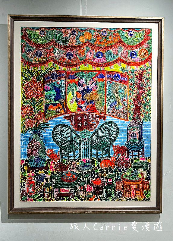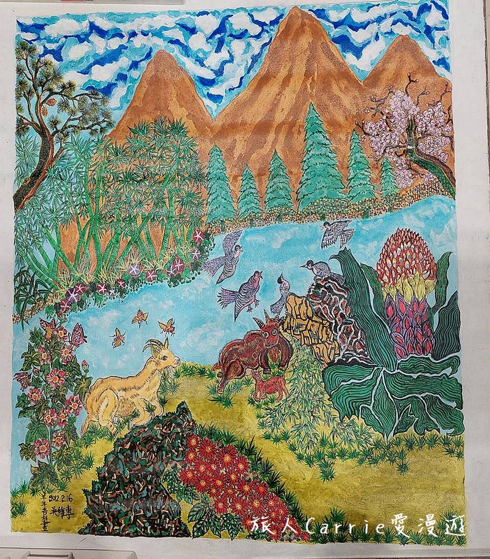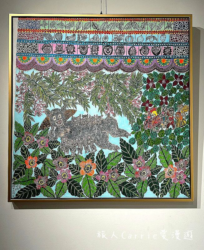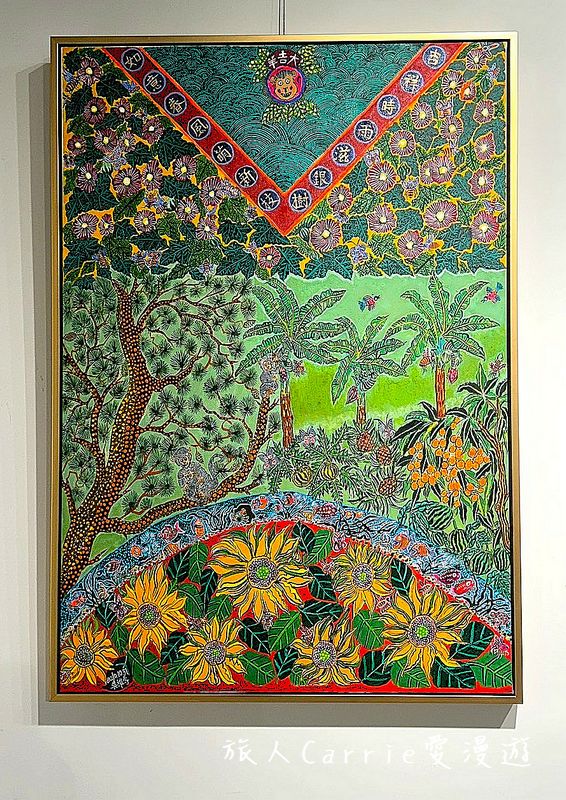 細緻的點描與勾勒:每一片葉脈、每一朵花瓣,甚至是豬身上的毛髮,都由無數細碎且規律的筆觸點簇而成。這種「不留白」的飽滿風格,展現了畫家極大的耐心,也傳達出一種「圓滿」的哲學。