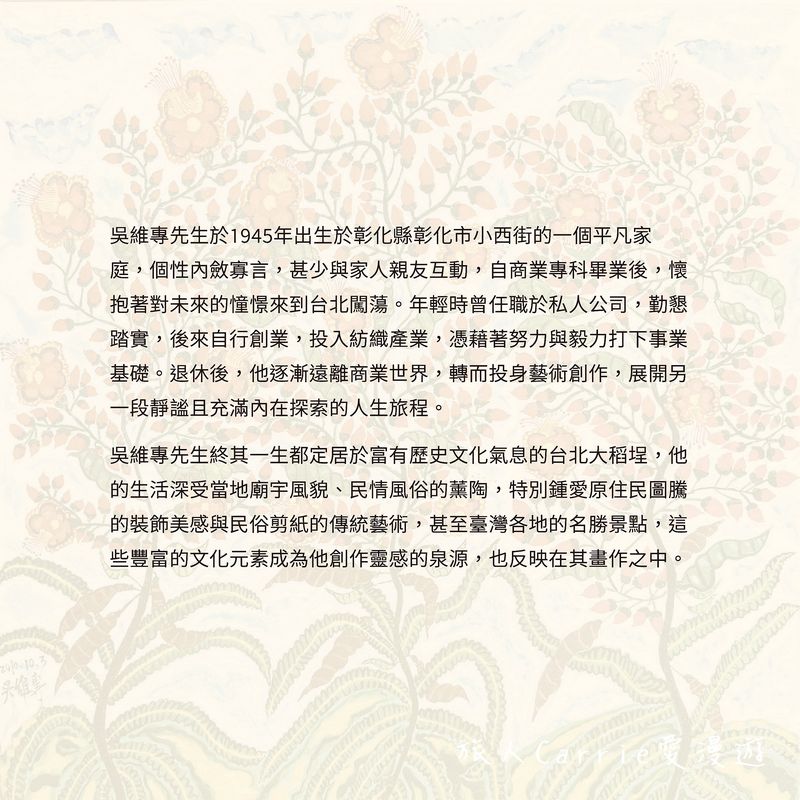 吳維專先生終其一生都定居於富有歷史文化氣息的台北大稻埕,他的生活深受當地廟宇風貌、民情風俗的薰陶,特別鍾愛原住民圖騰的裝飾美感與民俗剪紙的傳統藝術,甚至臺灣各地的名勝景點,這些豐富的文化元素成為他創作靈感的泉源,也反映在其畫作之中。