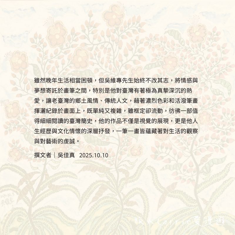 雖然晚年生活相當困頓,但吳維專先生始終不改其志,將情感與夢想寄託於畫筆之間,特別是他對臺灣有著極為真摯深沉的熱愛,讓老臺灣的鄉土風情、傳統人文,藉著濃烈色彩和活潑筆畫揮灑紀錄於畫面上,既單純又複雜,雖框定卻流動,彷彿一部值得細細閱讀的臺灣簡史,他的作品不僅是視覺的展現,更是他人生經歷與文化情懷的深層抒發,一筆一畫皆蘊藏著對生活的觀察與對藝術的虔誠。