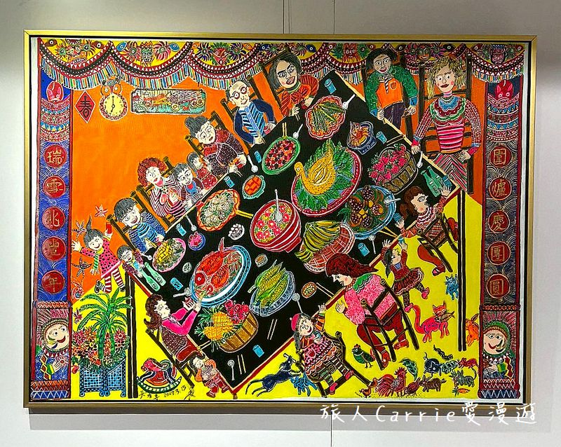 人物的鏈結:圍繞著長桌的是三代同堂的家族成員,每個人物神情生動、姿態各異。畫家並不刻意追求寫實的比例,而是透過誇張而真摯的表情,傳達出家人間親密的互動與過年的喜悅。