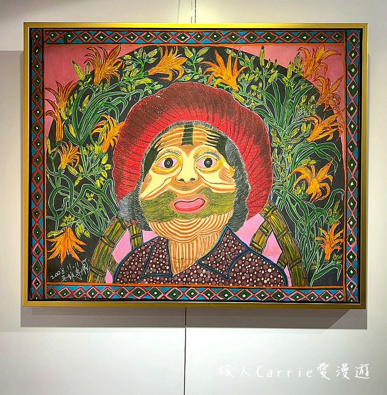 畫作四周鑲嵌了一圈細緻的菱形幾何邊框。這種菱形紋在泰雅族傳統織物中象徵著「祖靈的眼睛」,代表著祖先的看顧與祝福。這種裝飾性的收尾讓畫作不僅是一幅人像畫,更具備了如祭祀圖騰般的莊嚴感。