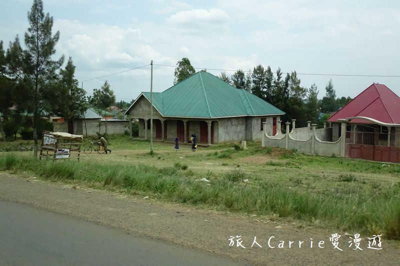後方淡黃色的平房是當地常見的磚造或土造住宅,屋頂多為鐵皮。,