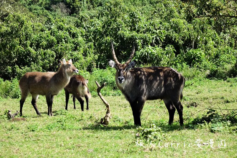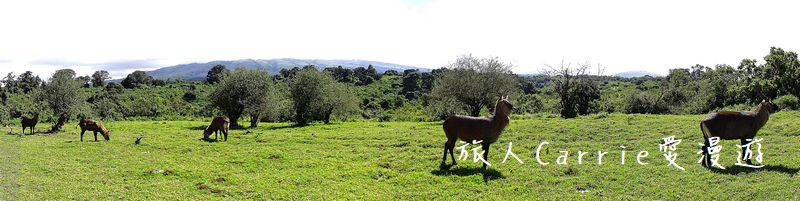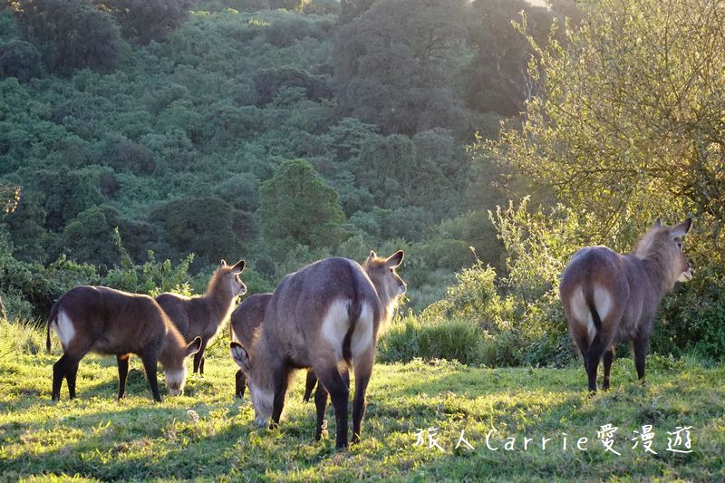 2019/08/03 (六)坦尚尼亞Tanzania DAY 3,坦尚尼亞賽倫蓋提第三天,這天要離開要前往恩戈羅恩戈羅保護區(Ngorongoro Conservation Area),藍天白雲,晴空萬里,草原上偶爾會出現巨大岩石堆,這是火山形成岩石,以及從岩石中挺拔而出的大樹。看見鴕鳥、水牛、瞪羚,長得像小花豹的貓 Serval,是在別的地方沒見過的。沿途均為風塵非常大的石子路,一路顛簸被戲稱為非洲馬殺雞,搖到骨頭都快散了!途中經過一片整齊的樹林,看起來很像人工種植,其實是天然的,是被長頸鹿吃成很整齊的樣子!最後來到恩戈羅恩戈羅保護區(Ngorongoro Conservation Area)的住宿點 Rhino Lodge,是個老字號的高雅旅店,在房間陽台就可以欣賞到整群的野生水羚!