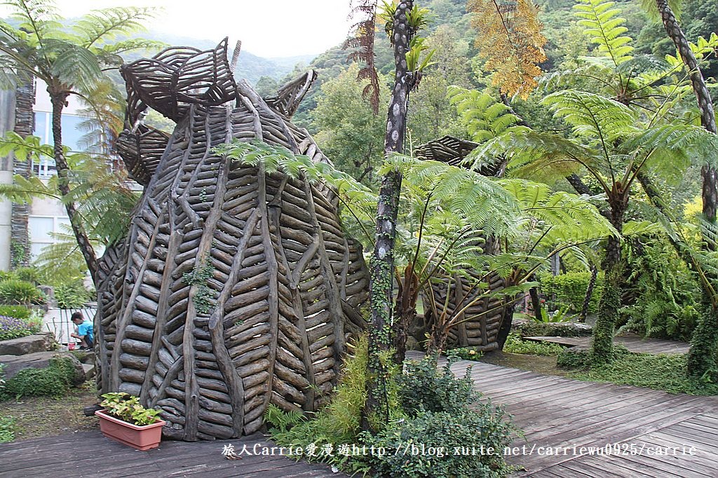 園區內精心布置了漂流木雕刻造景,酒瓶形狀的涼亭,
