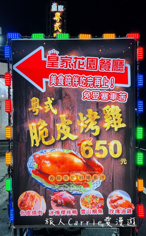 礁溪路甕缸雞烤雞是饕客造訪宜蘭必吃的礁溪美食,特別是這間位於宜蘭礁溪鄉礁溪路七段的「皇家花園餐廳-粵式脆皮烤雞」,更是一家嶄新的美食殿堂,斥資千萬裝潢高雅環境,超大方便免費的停車空間,道道大菜美食料理,烤雞、烤鴨、各式宜蘭經典美食,其中最惹人口水的就是吃了會吮指的粵式脆皮烤雞囉!除了美食,這裡居然還有可愛的迷你小馬和陸龜來陪你吃飯,小朋友看到都超級開心興奮的,帶小孩來到礁溪,千萬不要錯過,礁溪最佳親子餐廳「皇家花園餐廳」!餐廳內外更設置了一些網美拍照場景,更是網紅IG打卡美食!奢華的空間和展現主人氣派的菜色,適合春酒婚宴場地,家庭公司團體聚餐!必點的粵式脆皮烤雞、皇家綜合六拼盤、咖哩麵包蝦、日式海鮮餅、小卷米粉鍋,讓Carrie一家親朋好友吃過之後還念念不忘,2023全新開幕的礁溪必吃美食,週末假期如果沒有事先訂位,可是一位難求,記得先打電話預約喔!