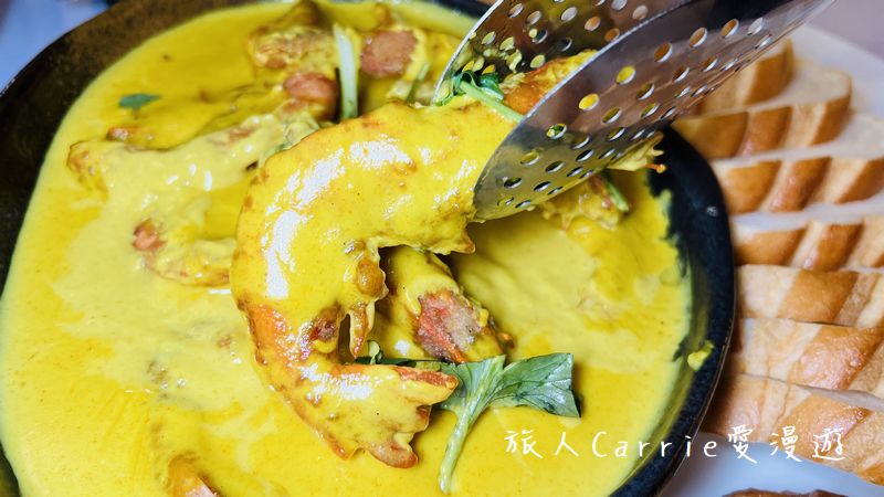 除了蝦子,沾滿咖哩醬汁的麵包吃起來更是順口,
